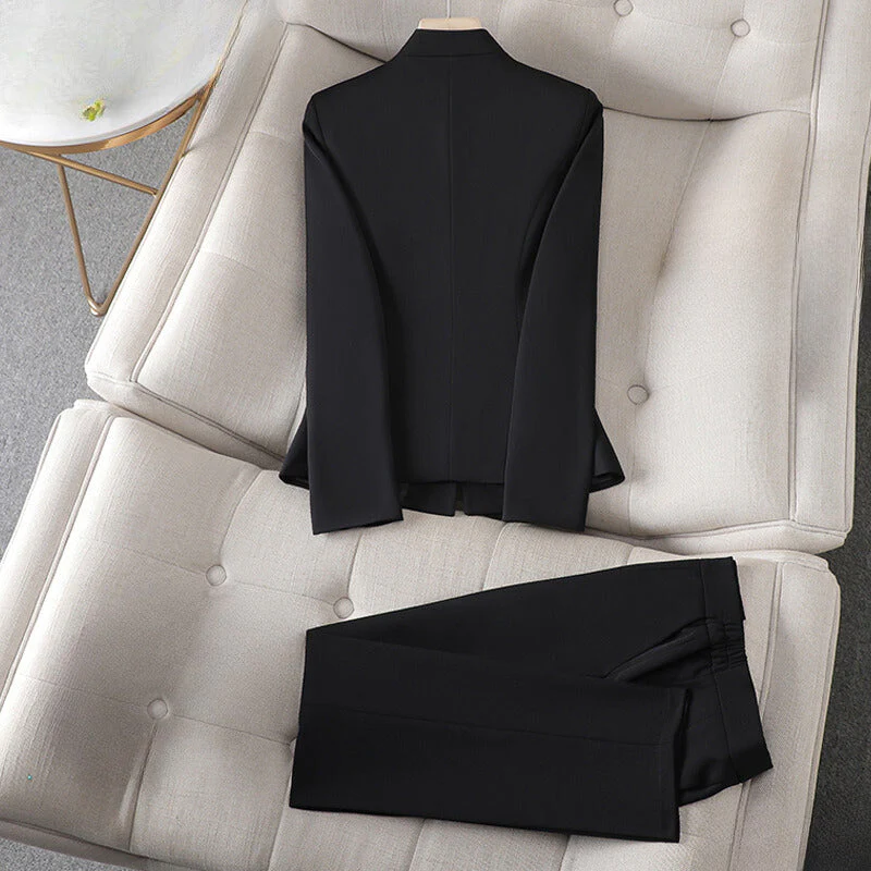 Dress to impress with the Elise Leroy Sleek Success Duo Set. This chic set features a classic blazer and matching pants, ideal for a sophisticated and stylish office look. The lapel collar and button closure detail add a touch of refinement to this essential ensemble.