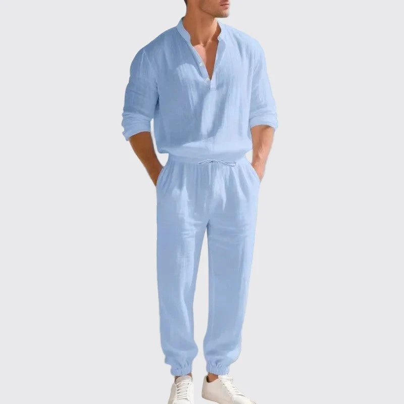 This matching two-piece set features a relaxed fit for an effortless, easygoing style ideal for warmer days. The long-sleeve top with an open neckline complements the drawstring pants, creating a comfortable and well-balanced look.