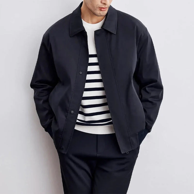This versatile jacket, available in navy blue, beige, and black, is designed to be the cornerstone of your outerwear collection. Its sleek silhouette is accentuated by a stylish turn-down collar, while the clean lines and minimalistic design offer a refined look.