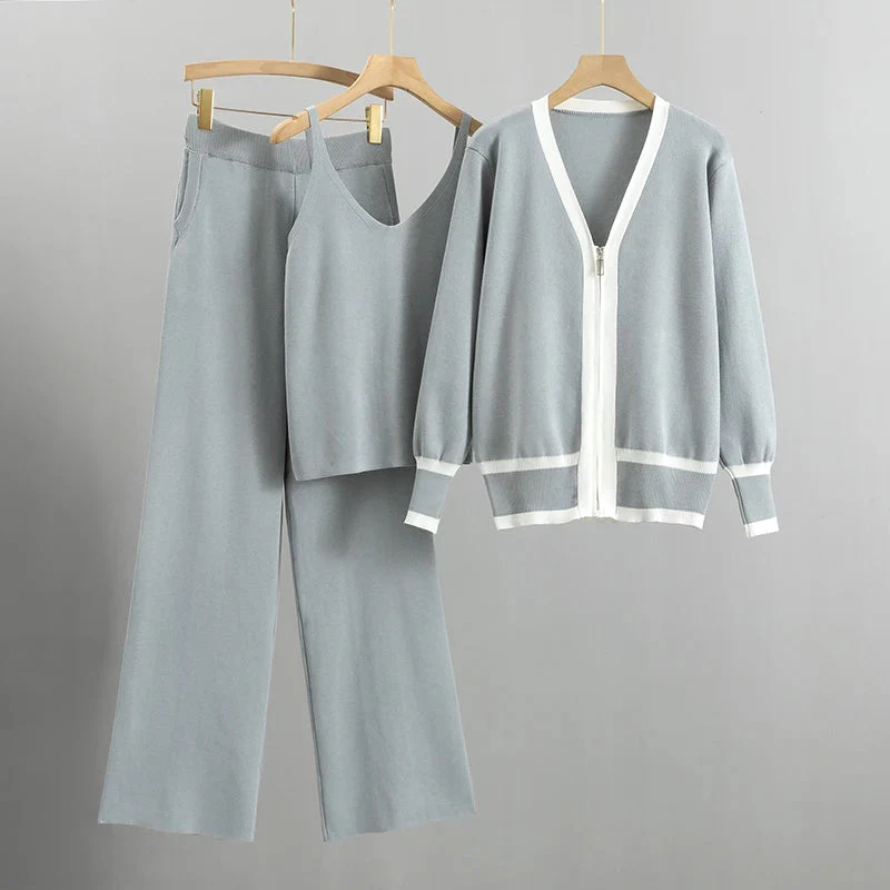 Introducing the Valentina Rossi Knitted 3 Piece Set—a versatile ensemble that seamlessly blends elegance with comfort. This set includes wide-leg pants, a sleeveless top, and a knitted cardigan, all designed to offer timeless sophistication for various occasions.